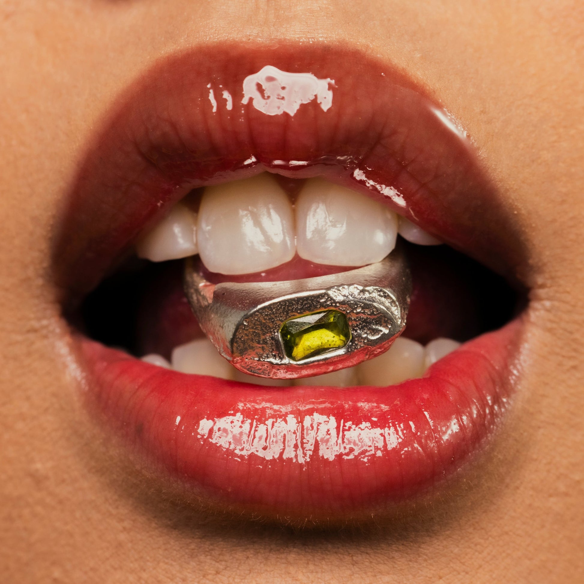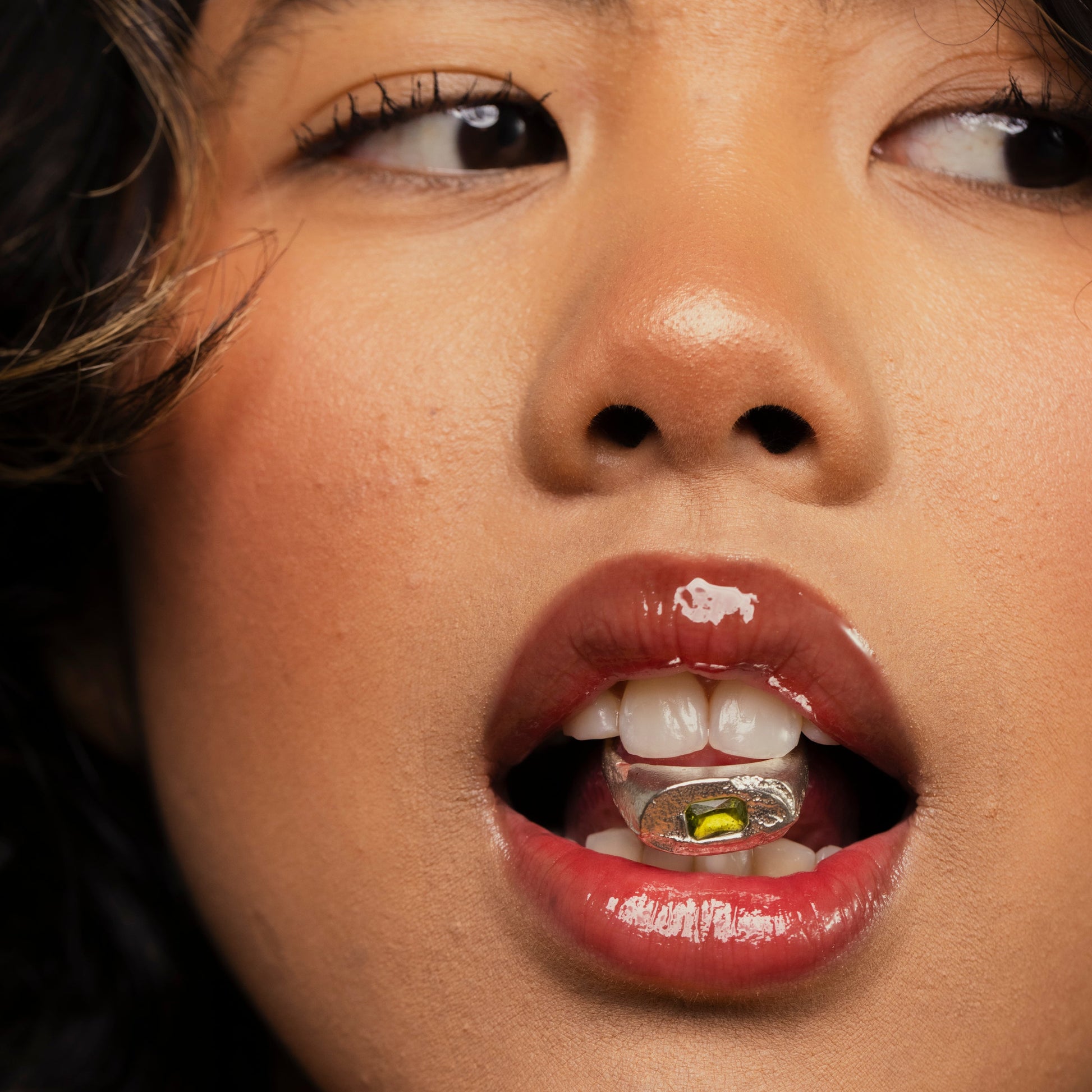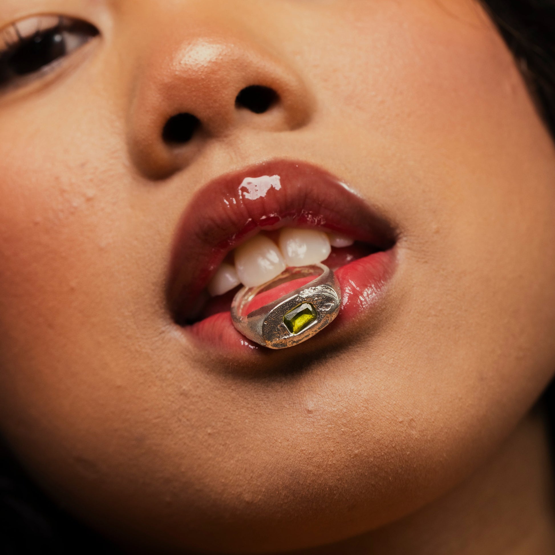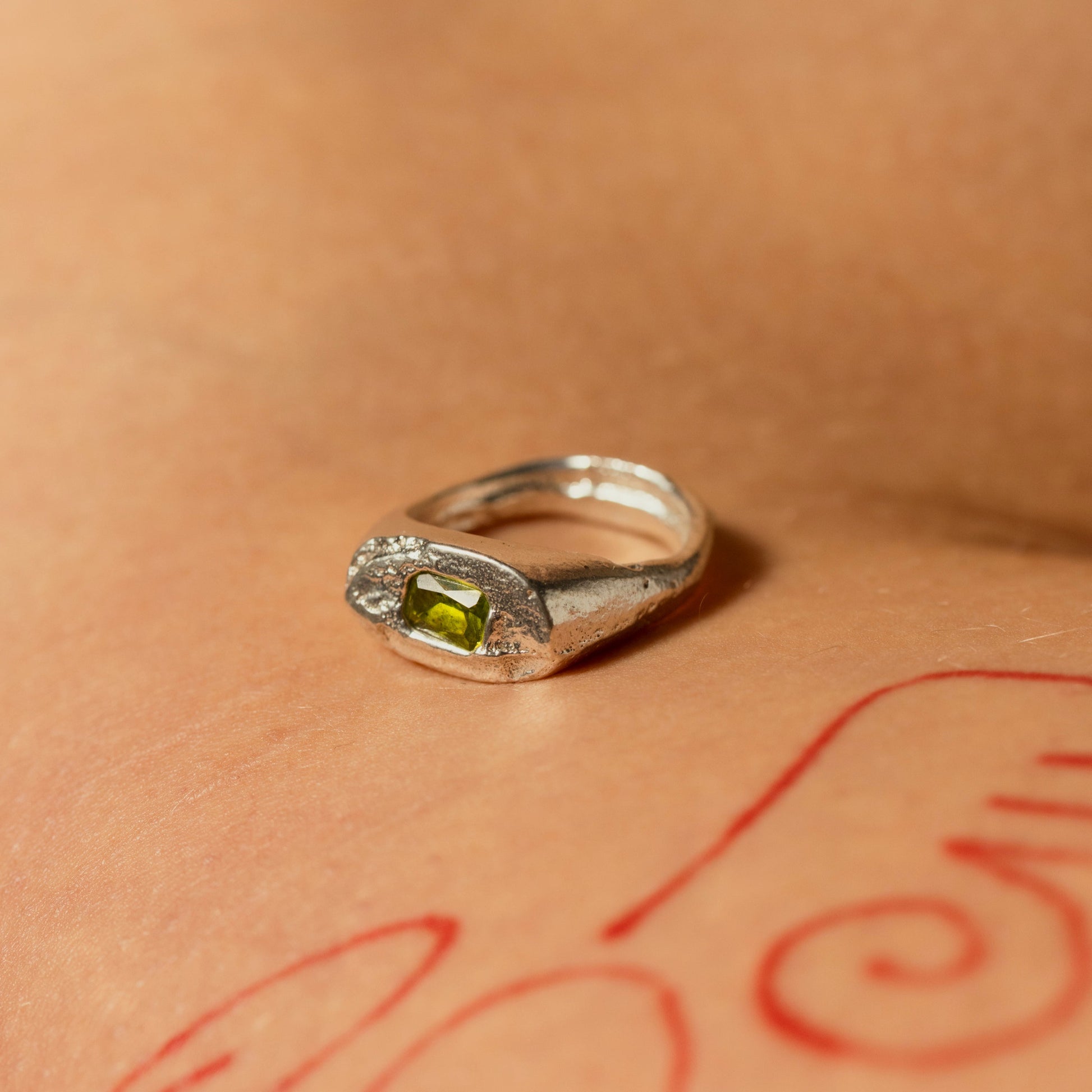Sand cast ring in sterling silver with radiant lab grown Peridot